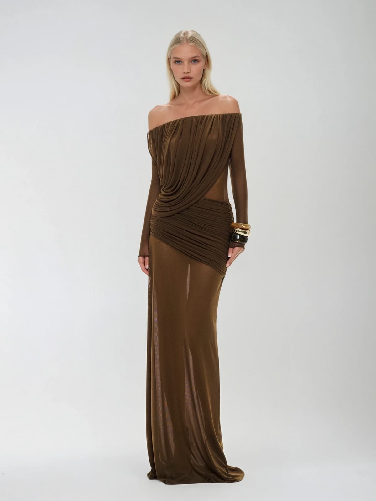 Upwellix Off Shoulder Draped Mesh Maxi Dress In Brown
