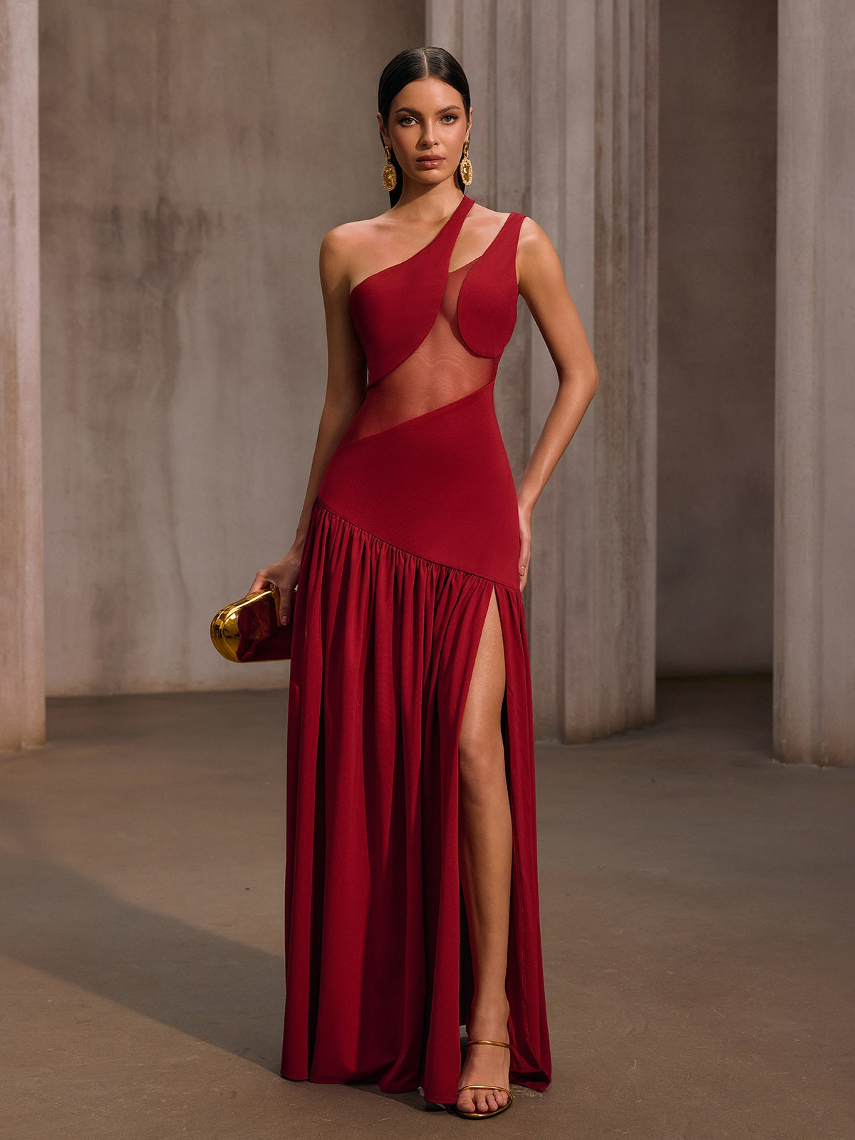 Lateefah One Shoulder Split Maxi Dress In Wine