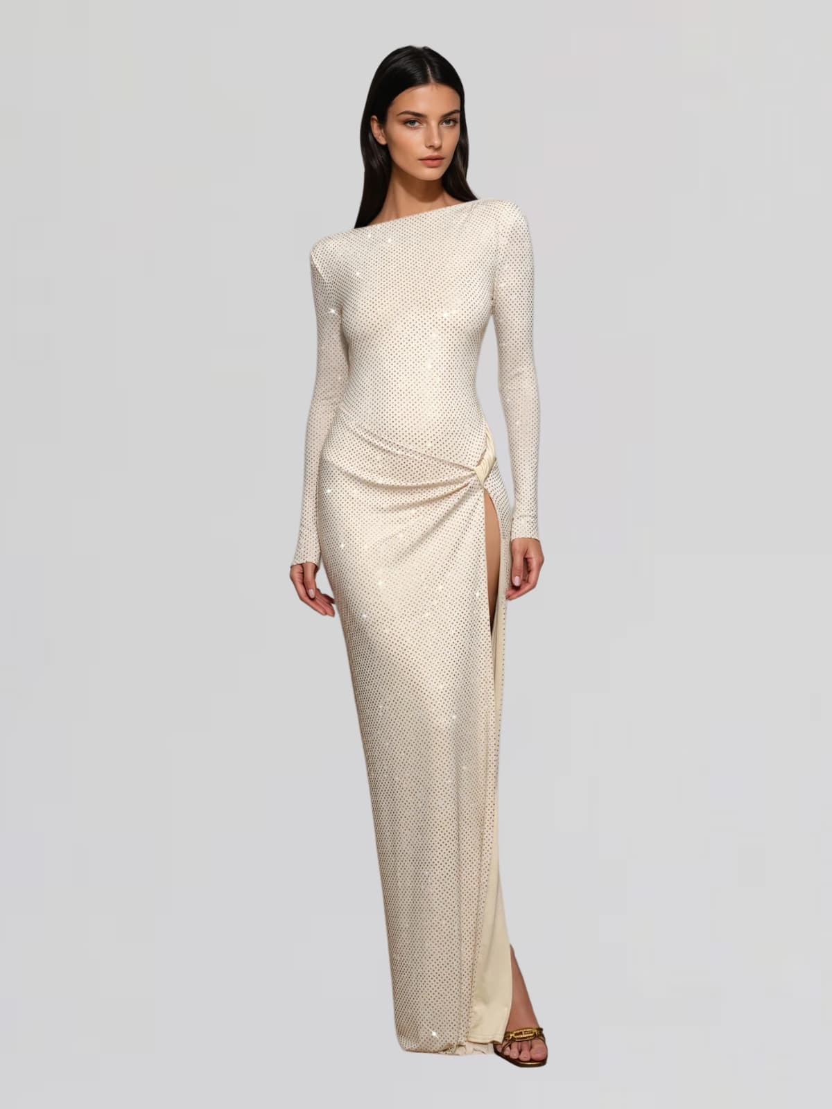 Oxavory Twisted Rhinestone Split Maxi Dress In Ivory