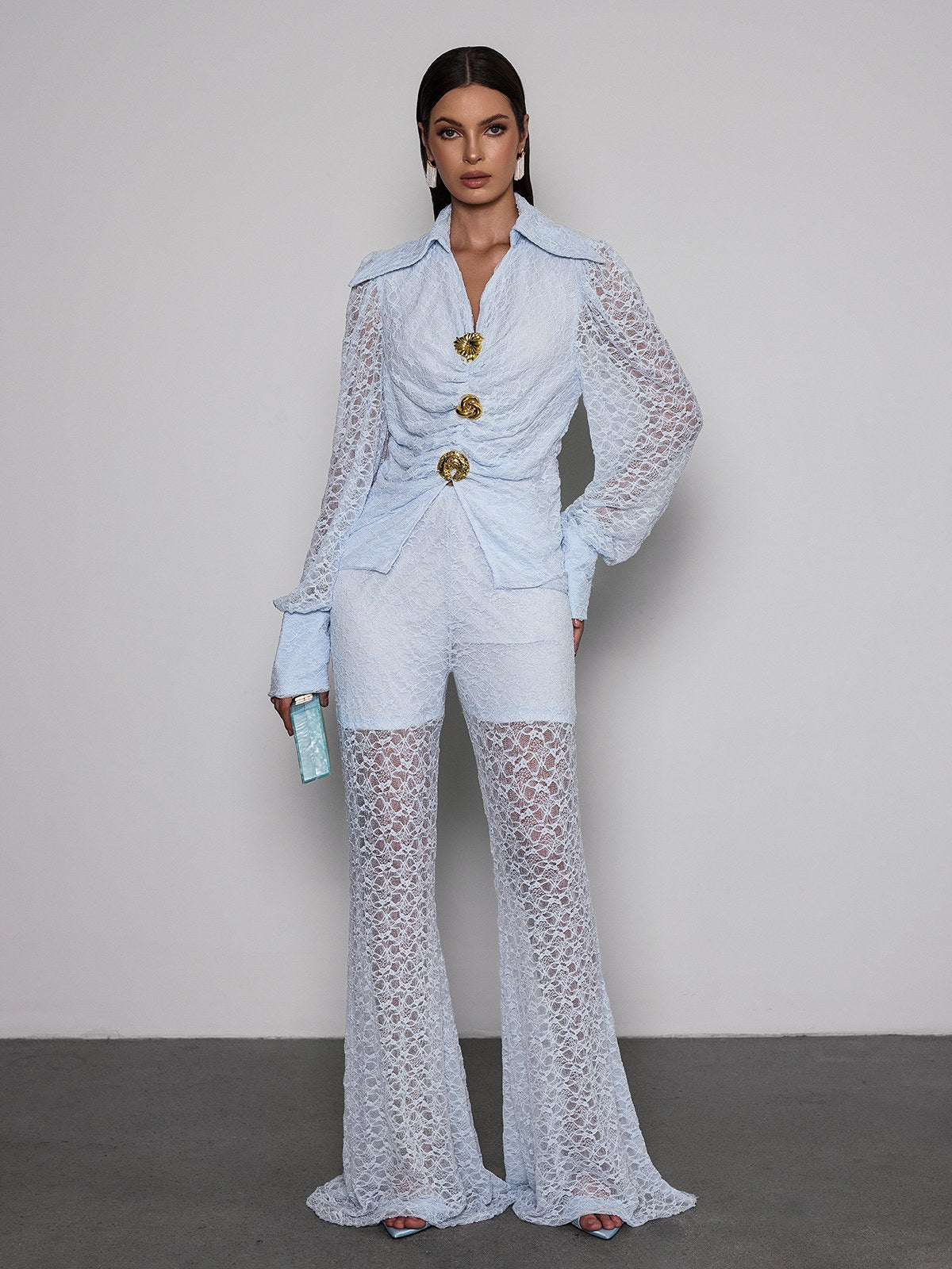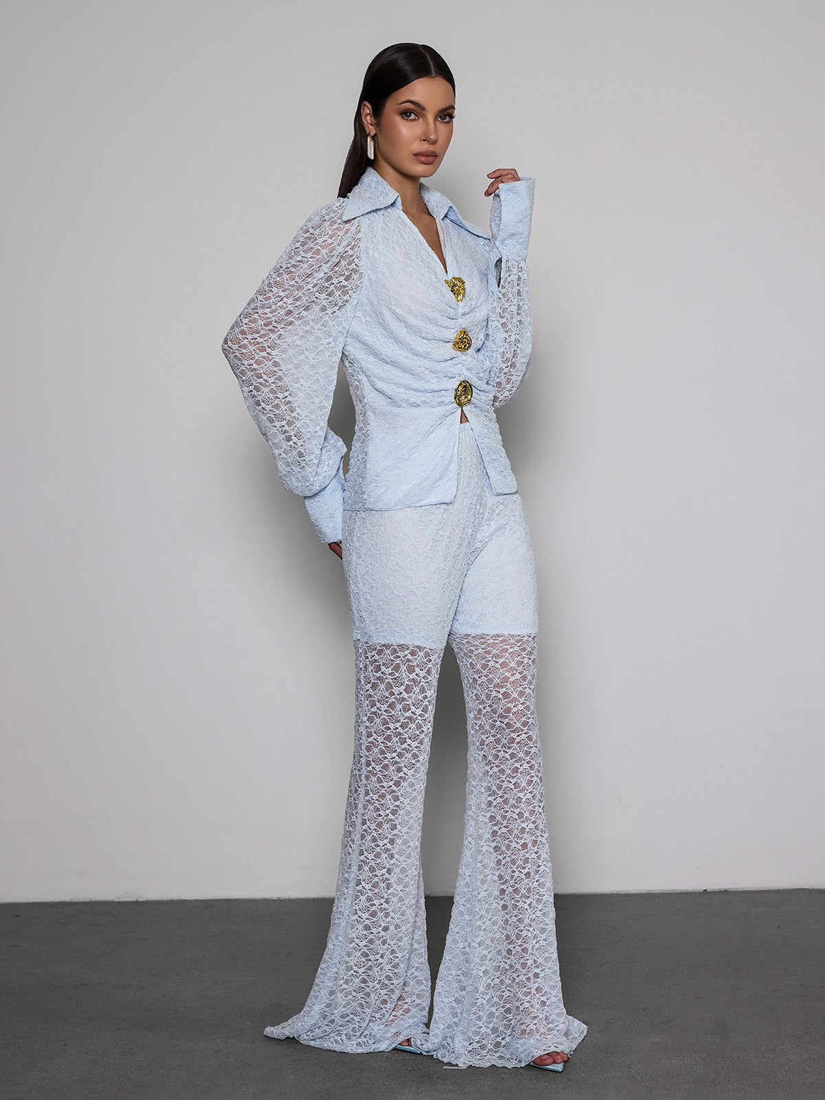 Noryxan Ruched Lace Flared Pants Set