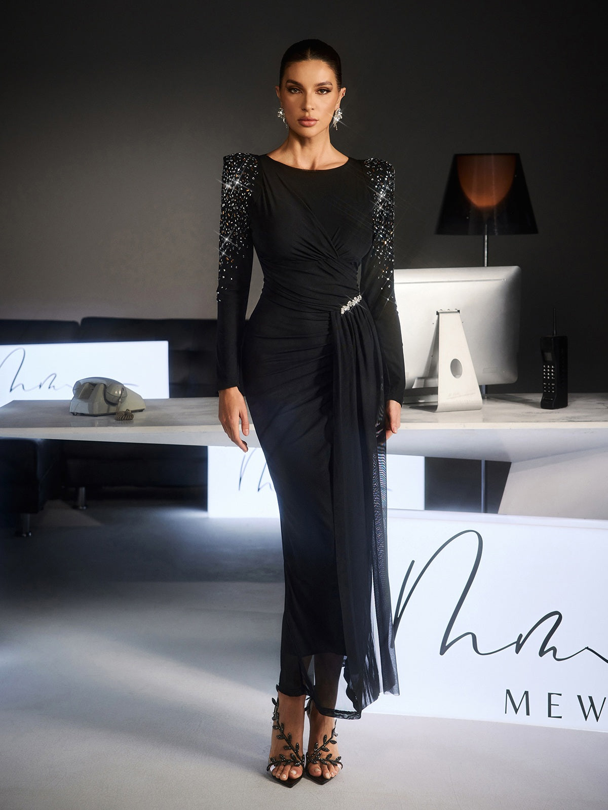 Fianna Long Slevee Ruched Rhinestone Maxi Dress