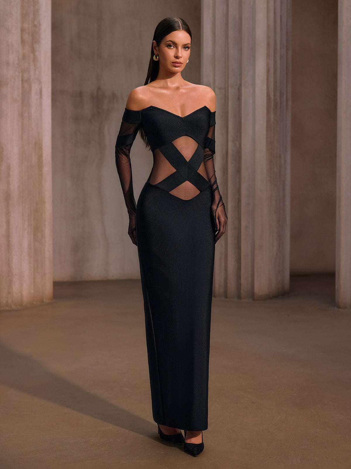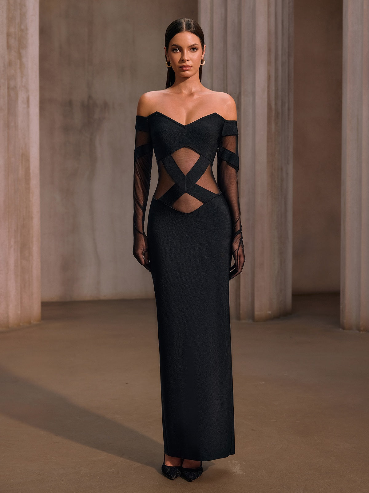 Yorynex Off Shoulder Mesh Bandage Maxi Dress