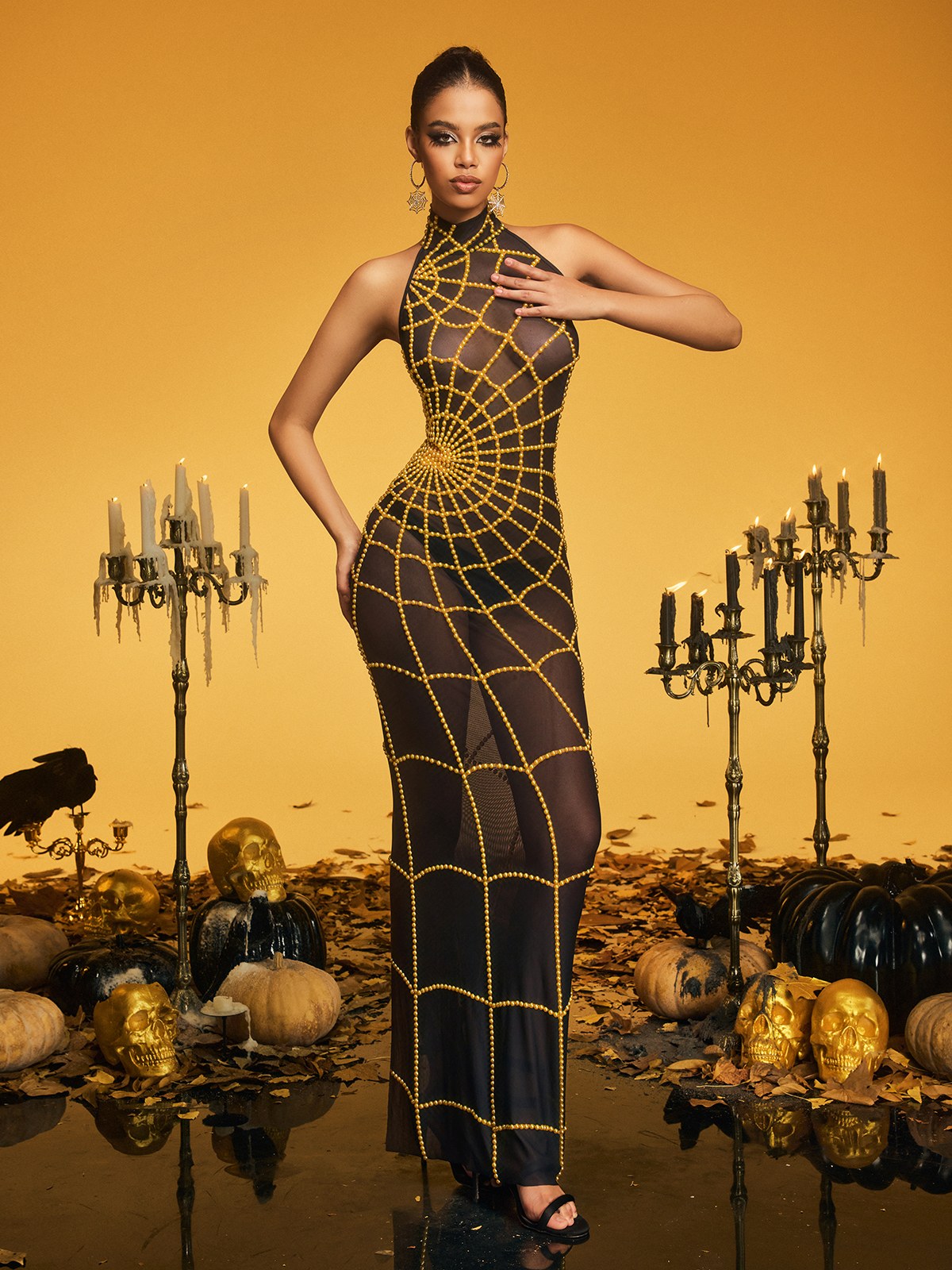 Kaelyra High Neck Cobweb Pearl Maxi Dress In Gold