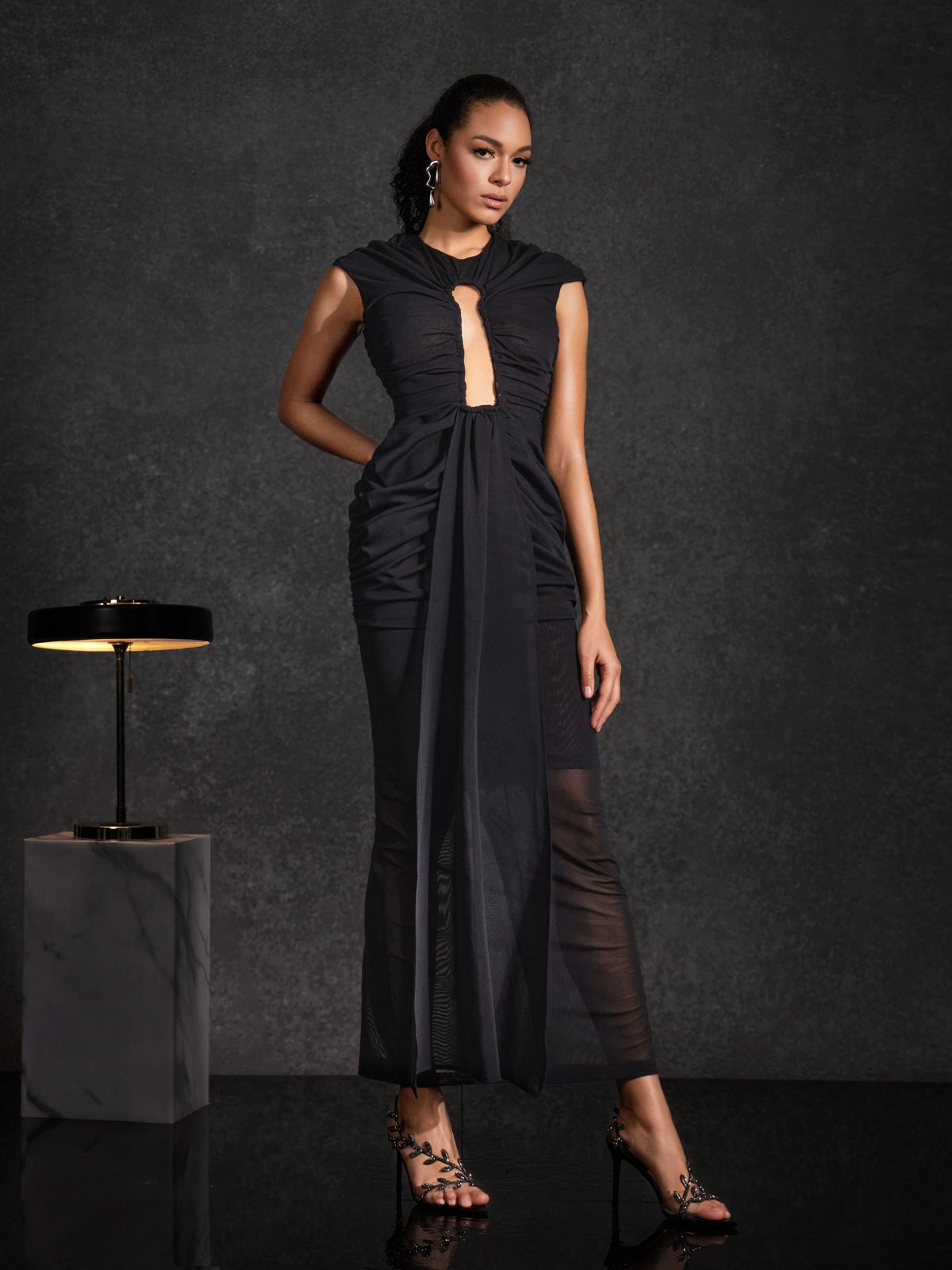 Drosyne Cutout Ruched Draped Maxi Dress In Black