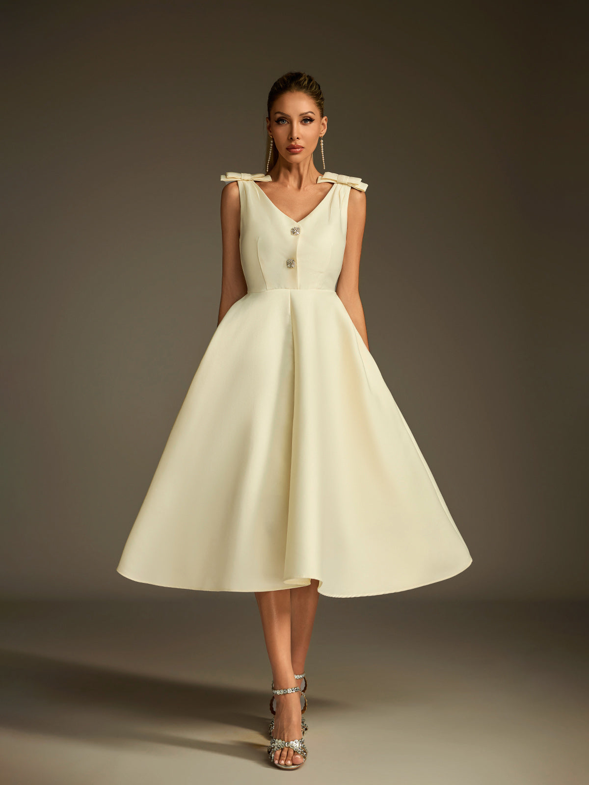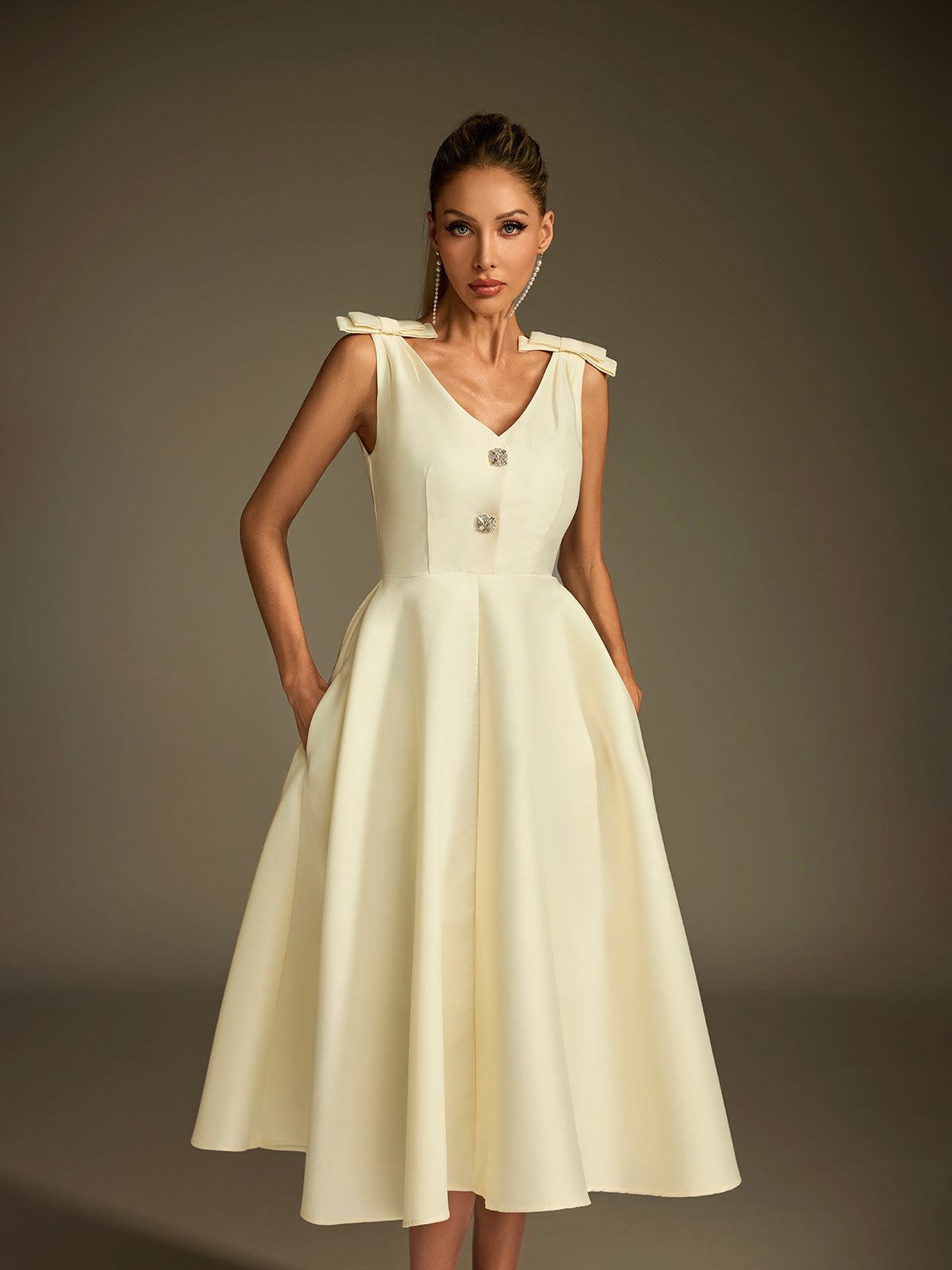 Diorum V Neck Bow Button Up Midi Dress