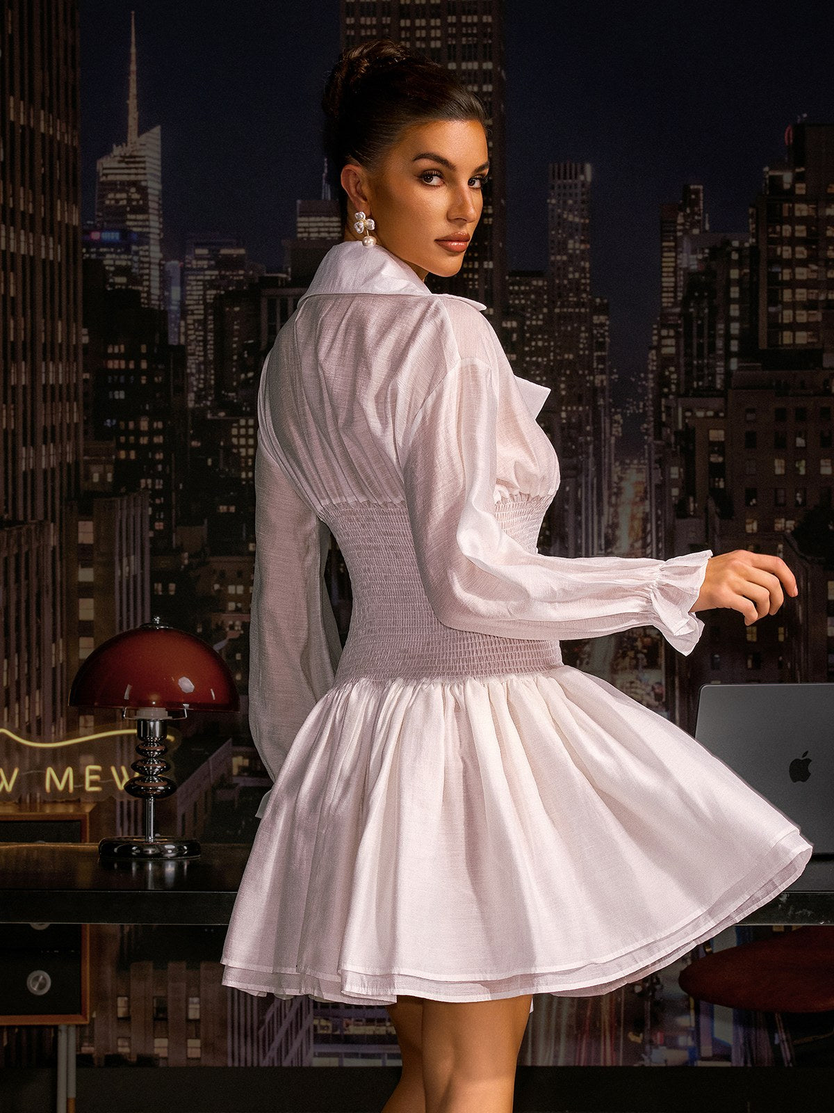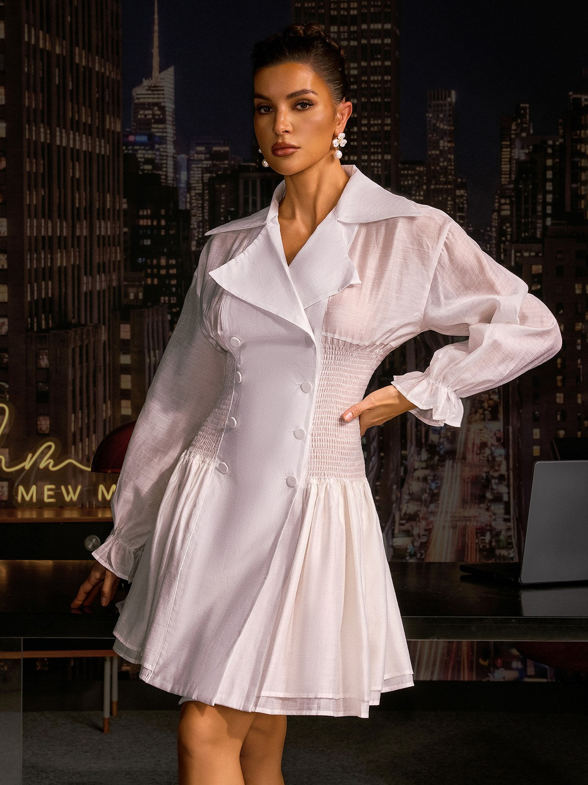 Exude polished confidence in the Angeliki Double Breasted Ruffle Mini Dress. where tailored structure meets playful femininity. The double-breasted front adds a sophisticated edge while cascading ruffles bring movement and charm to every step. Perfect for creating an impression at work events. casual outings. or anywhere you want to blend professional polish with contemporary style. This is the dress that proves you can be both powerful and pretty.