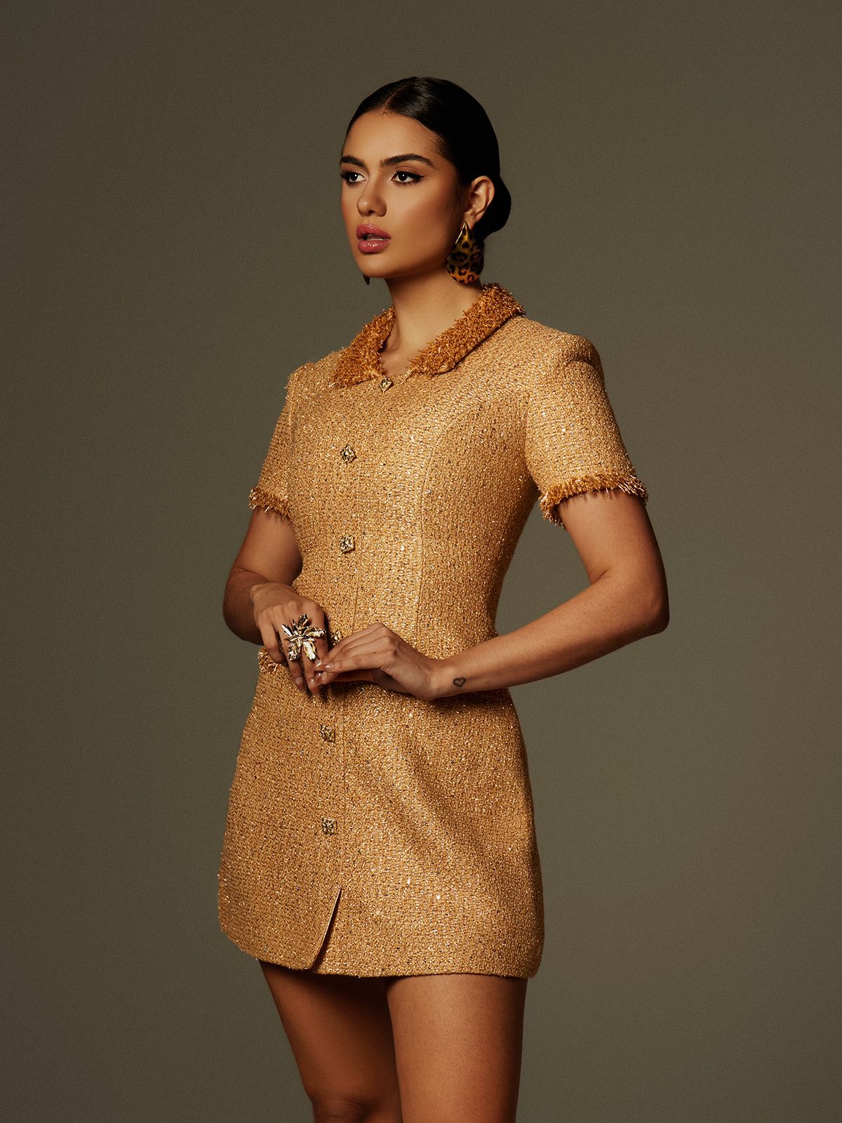 Introducing our Clarity Folded Collar Button Mini Dress! With its sleek folded collar and elegant button detailing. this dress is the perfect blend of sophistication and style. Made with high-quality materials. it offers both comfort and durability. A must-have for any fashion-forward individual looking to make a statement.