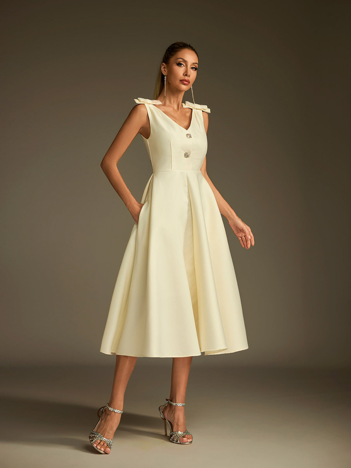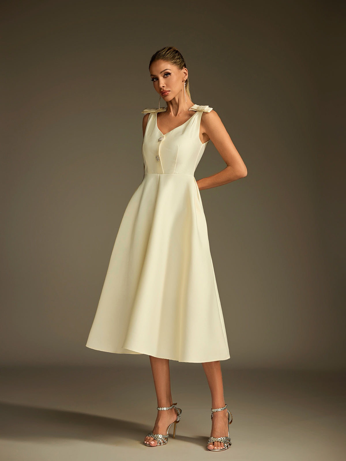 Elevate your style with the Diorum V Neck Bow Button Up Midi Dress. Featuring a flattering V-neckline and a charming bow detail. this dress combines elegance with a touch of femininity. The button-up front offers versatile styling options. while the midi length provides a graceful silhouette perfect for both day and evening occasions. Crafted to enhance your confidence and comfort. this dress is a timeless addition to your wardrobe. Make every moment memorable with Diorum's sophisticated design.