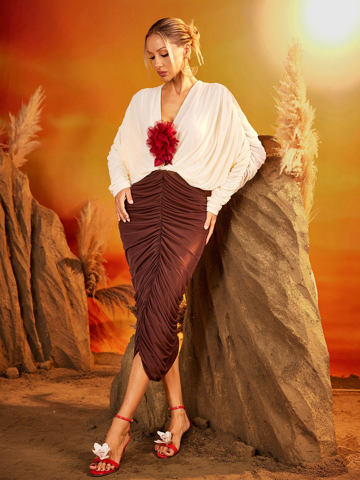 The Eldrik V Neck Flower Ruched Midi Dress combines feminine floral prints with a flattering ruched silhouette. Its V-neckline enhances your natural shape. while the midi length offers a perfect balance of elegance and comfort. Ideal for garden parties. brunches. or special occasions. this dress ensures you look effortlessly chic and feel confident all day long.