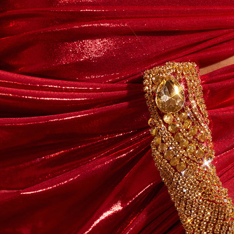 The Fingal One Shoulder Draped Metallic Maxi Dress transforms any occasion into a moment of elegance. Its asymmetrical one-shoulder design creates a sophisticated silhouette. while luxurious metallic fabric catches the light with every movement. The graceful draping adds dimension and fluidity. flattering your figure while delivering that coveted red-carpet glamour. Perfect for evening events. galas. or when you want to make an unforgettable impression. this statement piece combines modern style with timeless allure. Elevate your wardrobe with a dress that commands attention and exudes confidence.