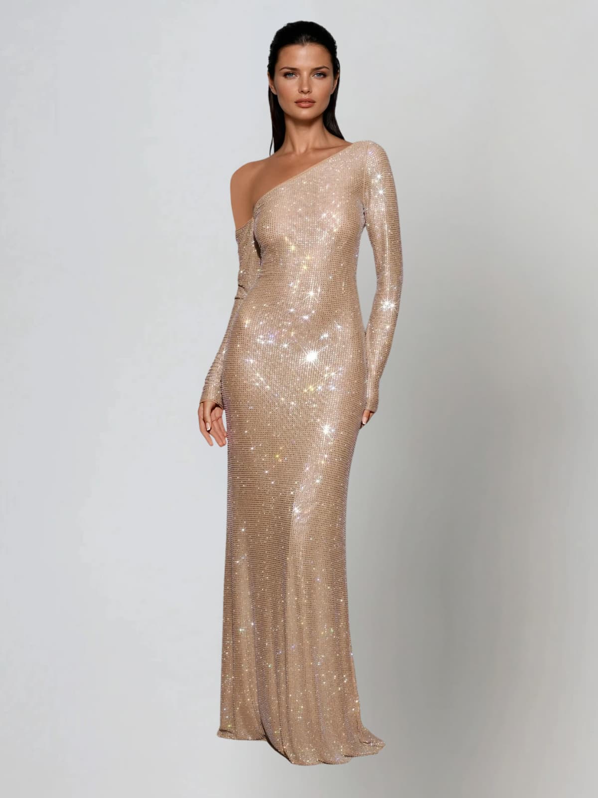 The Garneth One Shoulder Rhinestone Maxi Dress transforms any occasion into a showstopping moment. This elegant floor-length gown features a striking asymmetrical neckline that flatters every silhouette. while cascading rhinestones catch the light with every movement. The flowing maxi cut provides graceful movement and timeless sophistication. making it perfect for galas. weddings. or upscale evening events. Designed to make you feel confident and radiant. this dress combines modern style with glamorous details that ensure you'll turn heads all night long.