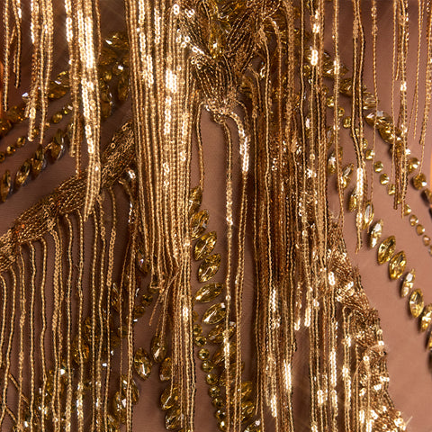 Elevate your evening elegance with this stunning Grabrola maxi dress. where luxurious sequins and shimmering crystals create an unforgettable shimmer. The flowing fringe detailing adds dynamic movement and sophistication. while the rich gold tone flatters every complexion. Perfect for galas. weddings. or special celebrations. this dress commands attention with its glamorous design and impeccable craftsmanship. Make a radiant statement and feel absolutely confident in a gown that transforms any occasion into a memorable moment.