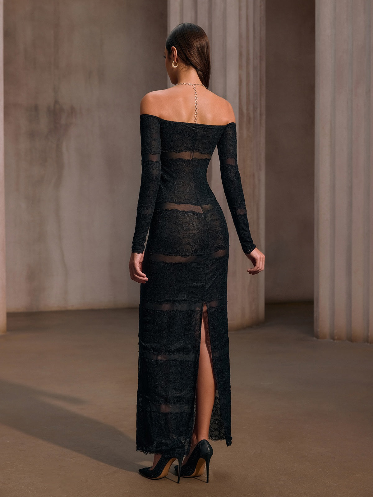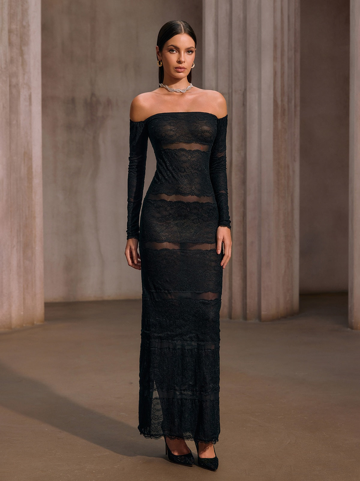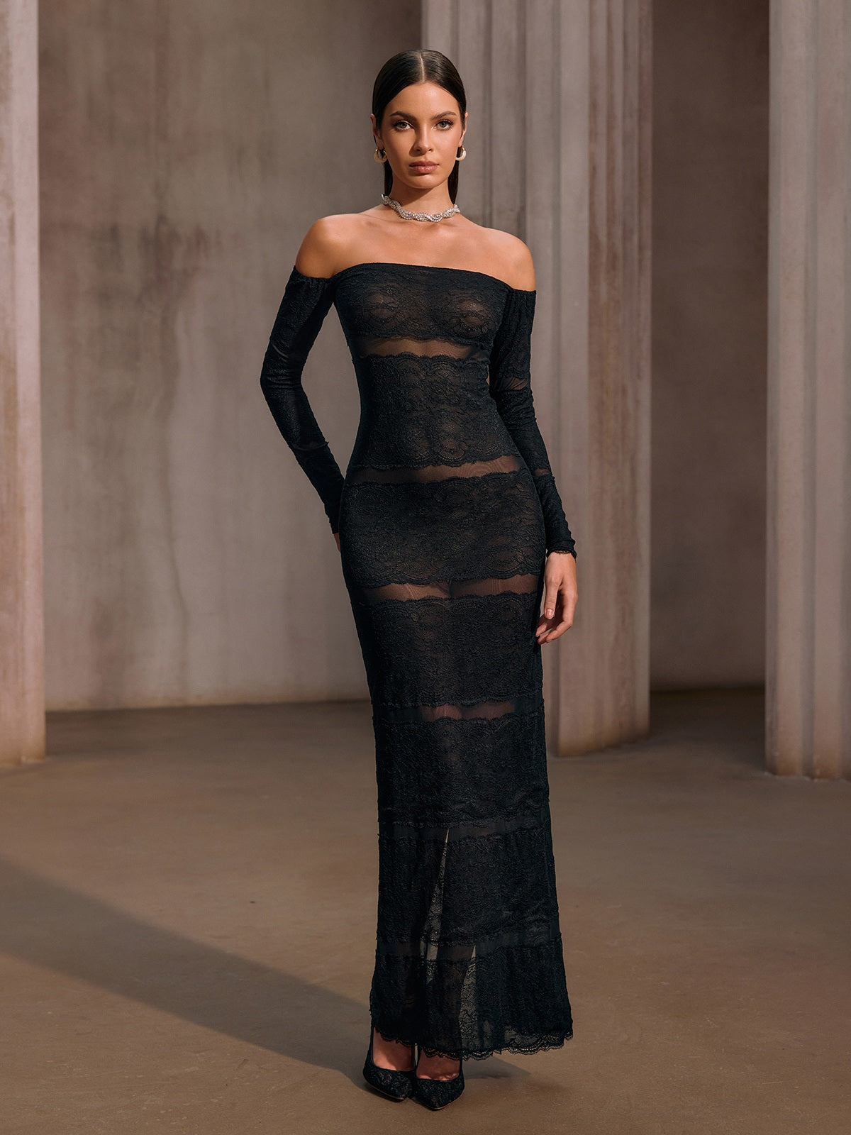 Elevate your evening look with this stunning Hirnox Off Shoulder Mesh Lace Maxi Dress. The delicate lace detailing and sheer mesh panels create an elegant. romantic silhouette that flatters the figure. The off-shoulder neckline adds a touch of sophistication and modern flair. perfect for special occasions. formal events. or upscale gatherings. The flowing maxi length provides graceful movement and timeless appeal. An ideal choice for those seeking a dress that combines feminine charm with contemporary style.