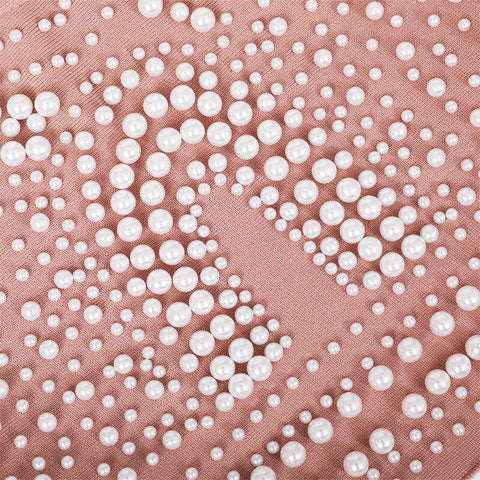 Turn heads wherever you go in this super chic embellished bandage dress. Made from stretchy bandage fabric. the Isabelle Halterneck Pearls Bandage Dress In Beige features a sleeveless halter bodice with an open back. a deep V-neckline. and a pearl bodice that accentuates the curves of the body. Pair this bandage dress with strappy heels or pointy toe pumps for a stunning head to toe look.