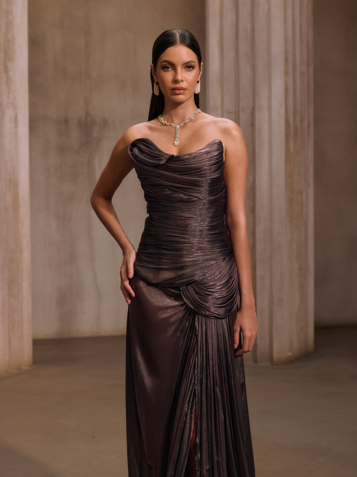 Elevate your evening wardrobe with this sophisticated Kawasakix Strapless Ruched Split Maxi Dress In Mauve Brown. expertly crafted in a luxurious brown hue. The ruched detailing creates flattering dimension across the bodice. while the dramatic side split adds movement and contemporary flair. The strapless neckline offers a refined. elegant silhouette perfect for formal events. galas. or upscale celebrations. Constructed with attention to detail. this dress combines timeless elegance with modern design elements. ensuring you make a striking impression. An ideal choice for those seeking a show-stopping piece that balances glamour with wearable sophistication.