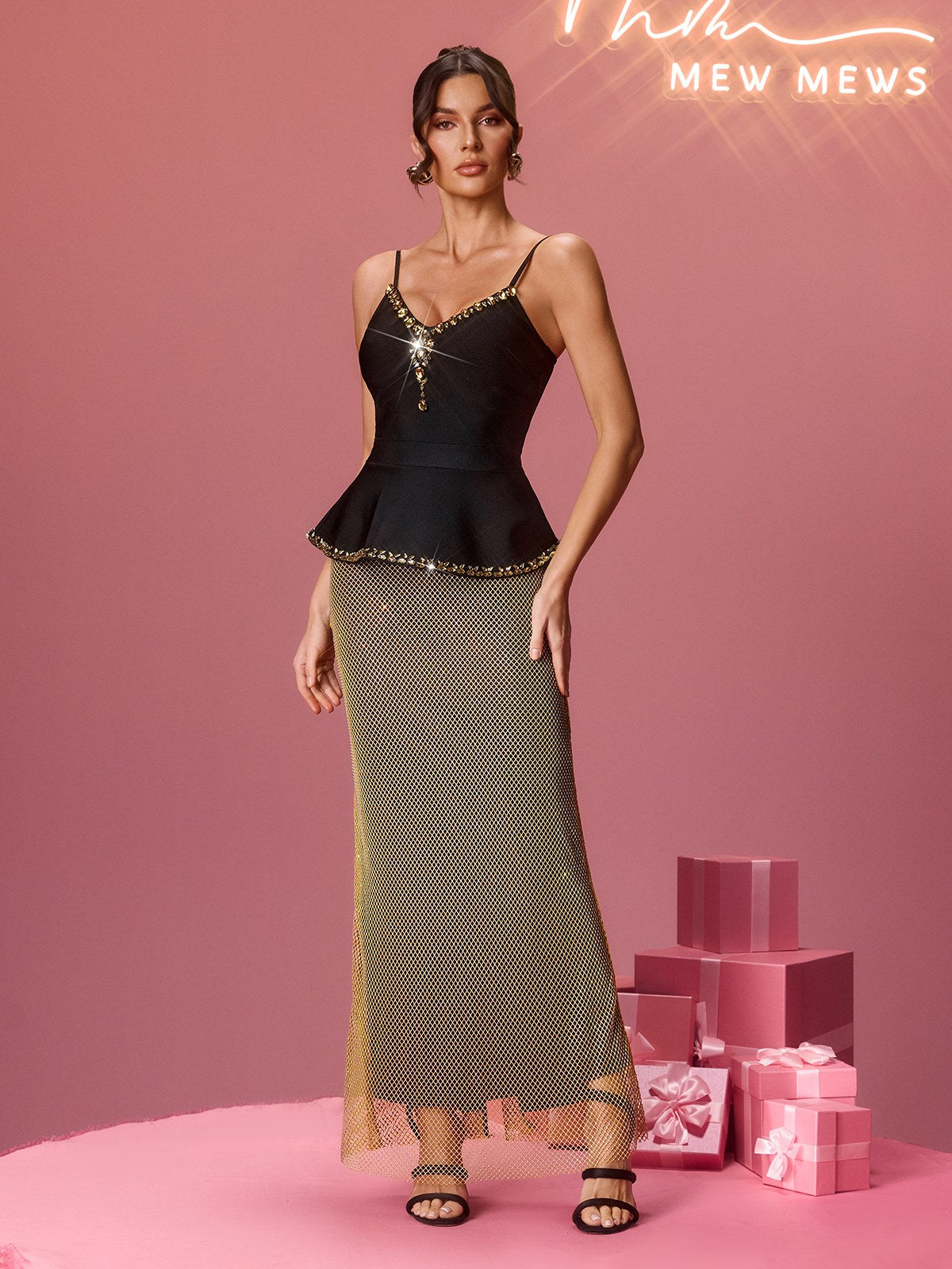 Elevate your evening look with the Klyra Spaghetti Rhinestone Mesh Skirt Set. where glamour meets sophistication. This stunning two-piece features delicate spaghetti straps and shimmering rhinestone embellishments that catch the light beautifully. while the mesh construction adds an alluring. modern edge. Perfect for special occasions. nights out. or whenever you want to turn heads. this set combines elegance with undeniable sparkle. The flattering silhouette and premium details make it an investment piece that transforms any moment into something memorable.