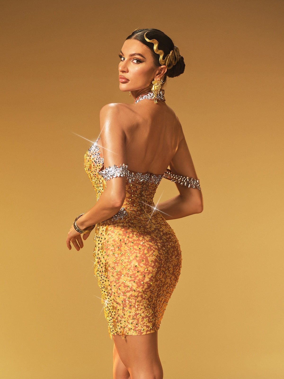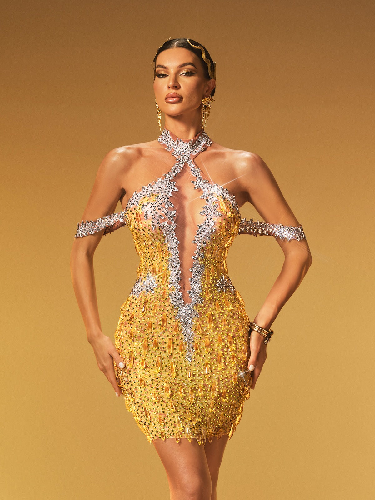 Elevate your evening with the Krythos Halterneck Crystal Mesh Mini Dress in Chartreuse. This stunning dress features a shimmering crystal mesh fabric that catches the light beautifully. creating a captivating glow. The halterneck design highlights your shoulders and neckline. while the mini length adds a bold. confident edge. Perfect for making a memorable impression at any event. this dress combines elegance with a modern. daring flair. Step into the spotlight and let your style shine.