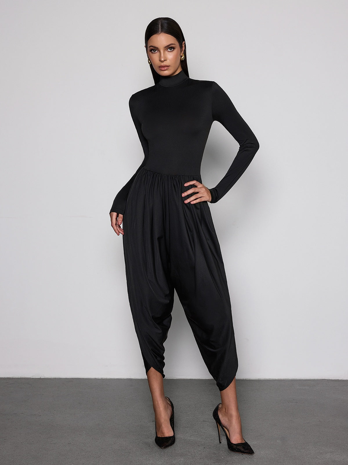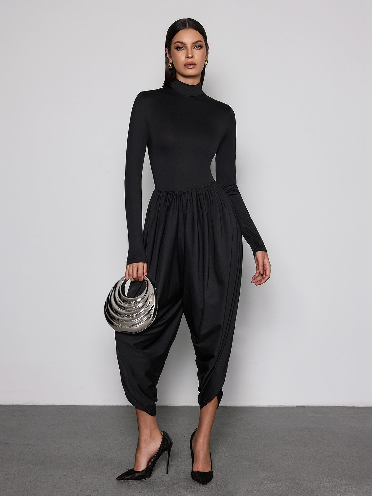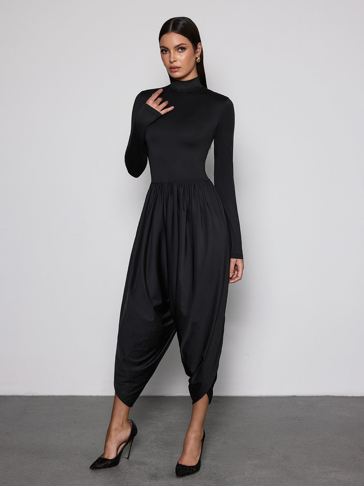 Discover bold sophistication with the Laurien Long Sleeve Ruched Jumpsuit. Its flattering ruched detailing enhances your silhouette. while the long sleeves add a touch of elegance and coverage. Designed for both comfort and style. this jumpsuit is perfect for making a confident statement at any event or night out. Step into versatile glamour that effortlessly elevates your look.