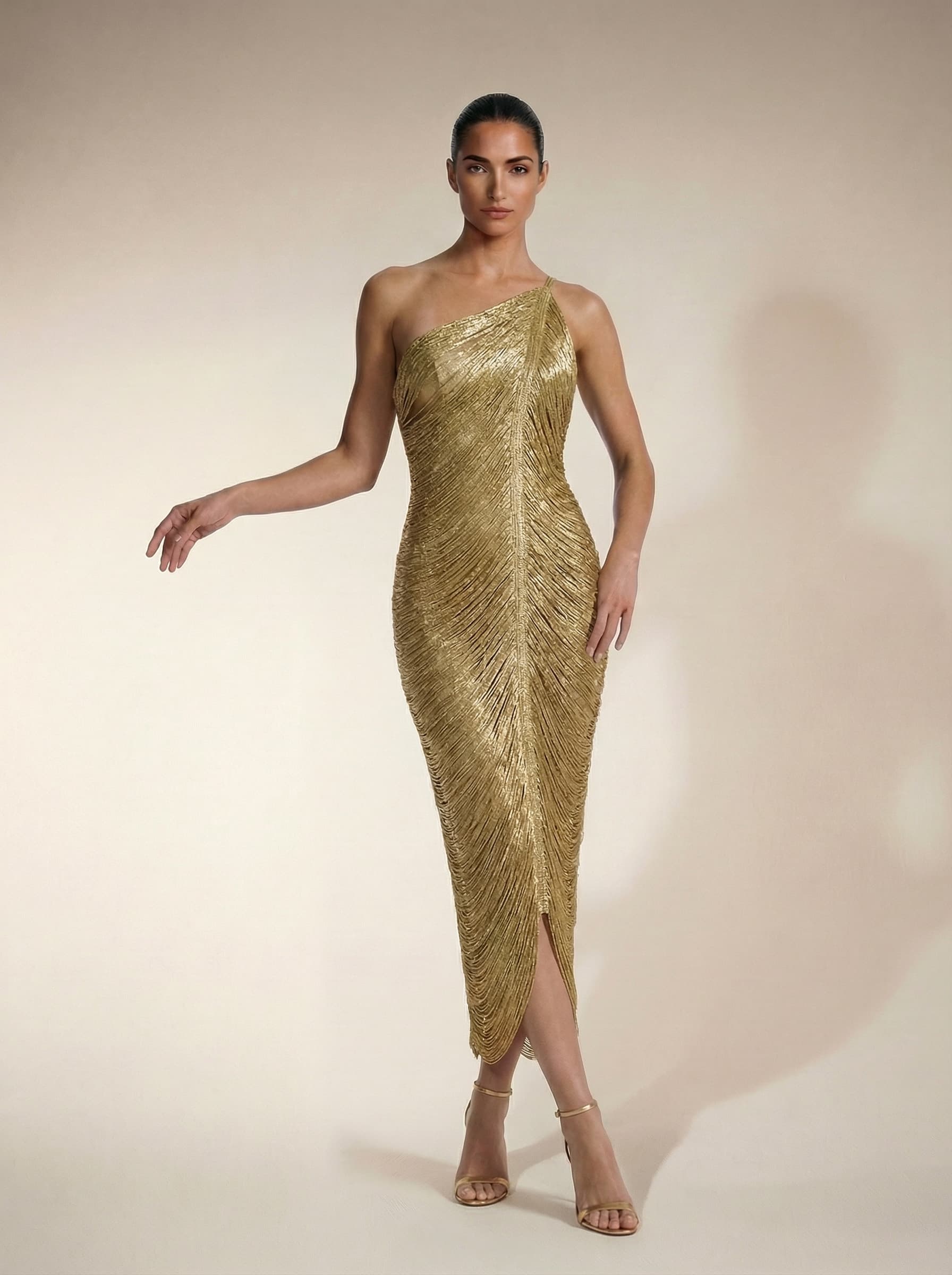 Elevate your evening look with the Lexila One Shoulder Fringe Midi Dress. This sophisticated piece features an asymmetrical one-shoulder neckline that creates an effortlessly chic silhouette. while cascading fringe details add movement and playful texture. The midi length offers versatile styling for cocktail events. parties. or special occasions. Crafted for comfort and confidence. this dress transitions seamlessly from day to night with the right accessories. Perfect for making a statement without compromising on elegance.