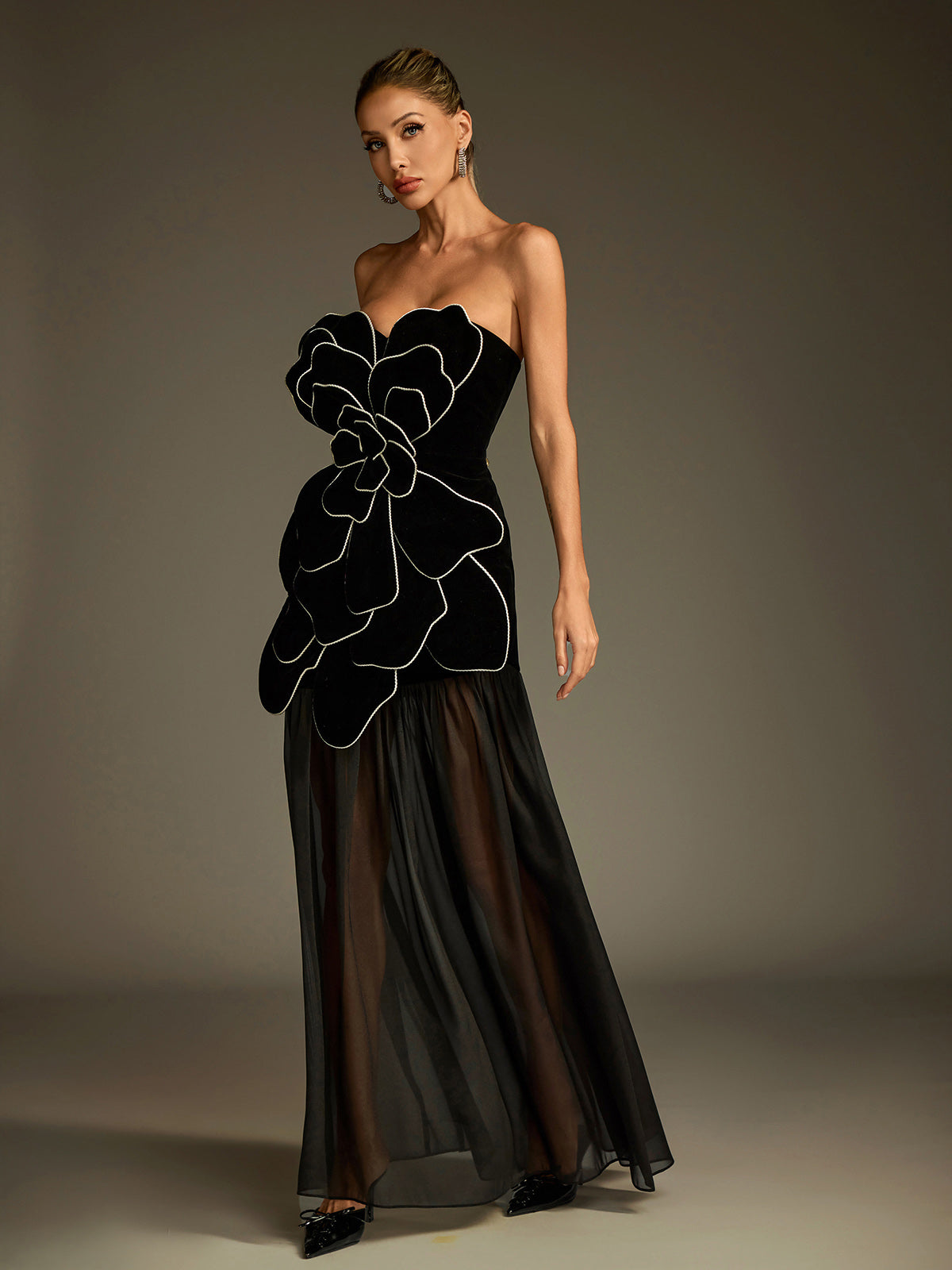 Embrace romantic elegance with the Luffy Strapless Flower Mesh Maxi Dress. Featuring delicate floral mesh and a graceful strapless design. this maxi dress flows beautifully to create a captivating silhouette. Perfect for special occasions or evening events. it effortlessly combines femininity and sophistication for a look that truly stands out.