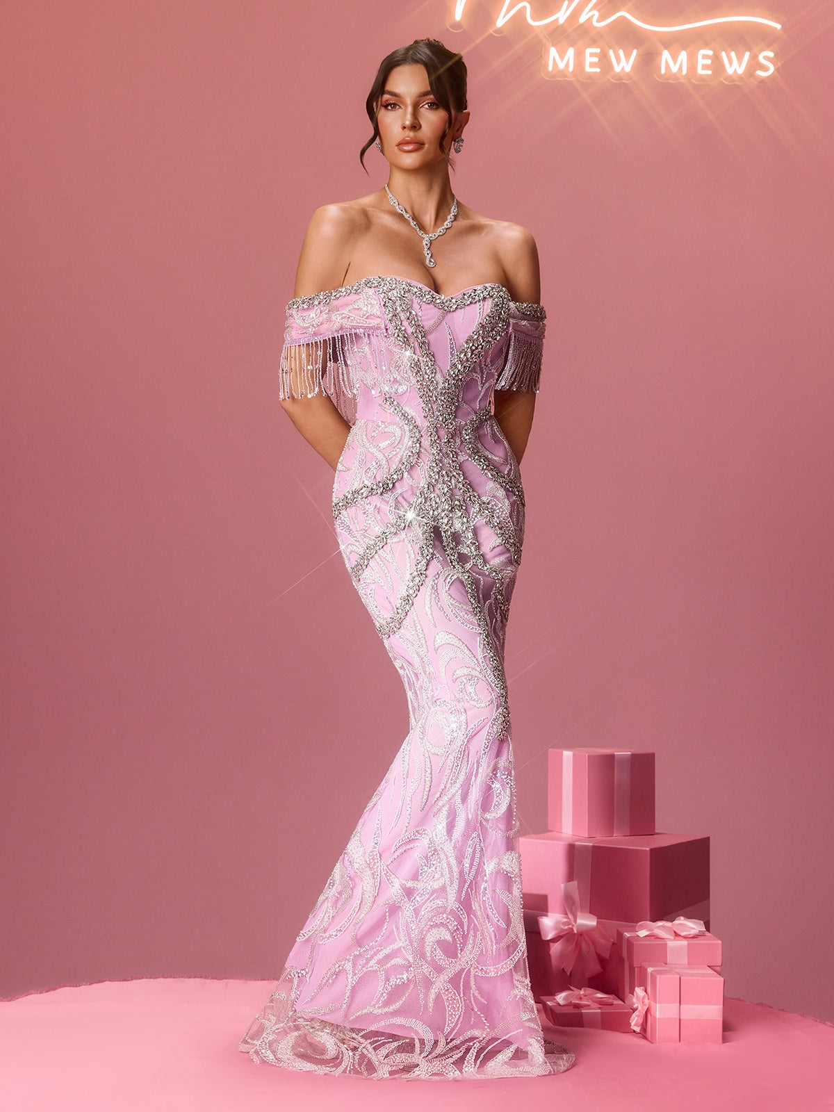 Elevate your evening elegance with this stunning Mylonitor Off Shoulder Fringe Crystal Maxi Dress that commands attention. Delicate crystal embellishments cascade across the bodice. catching light with every movement. while luxurious fringe detailing adds dynamic flair and sophisticated texture. The off-shoulder neckline flatters your silhouette and creates an effortlessly chic. modern look perfect for galas. weddings. or upscale events. The flowing maxi length provides graceful movement and timeless appeal. This dress transforms you into the most captivating guest in the room—a true showstopper that celebrates your confidence and style.