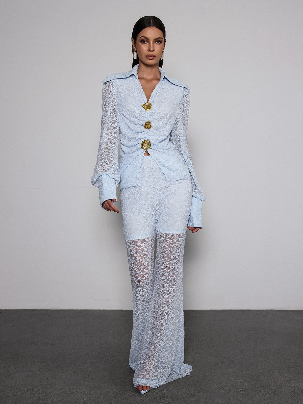 Elevate your wardrobe with the Noryxan Ruched Lace Flared Pants Set. where sophisticated elegance meets contemporary style. This stunning ensemble features delicate lace detailing and flattering ruched accents that create a refined silhouette. while the flared cut offers timeless appeal and comfortable movement. Perfect for date nights. special occasions. or when you want to make a confident statement. this set combines feminine charm with modern flair. The thoughtful design ensures you'll feel both beautiful and empowered. making it an essential addition to any fashion-forward closet.