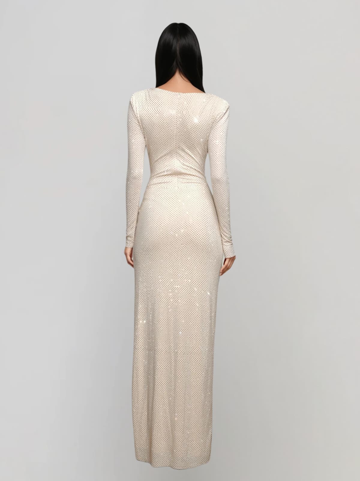 Make a lasting impression in this luxurious Oxavory Twisted Rhinestone Split Maxi Dress In Ivory. designed for those who embrace sophistication with a touch of sparkle. The twisted neckline flatters your frame while intricate rhinestone embellishments create an enchanting shimmer that commands attention. A graceful side slit adds movement and allure. balancing elegance with contemporary flair. The rich ivory hue exudes confidence and timeless style. making it an ideal choice for galas. weddings. and upscale celebrations. Invest in a dress that transforms any moment into an unforgettable experience.