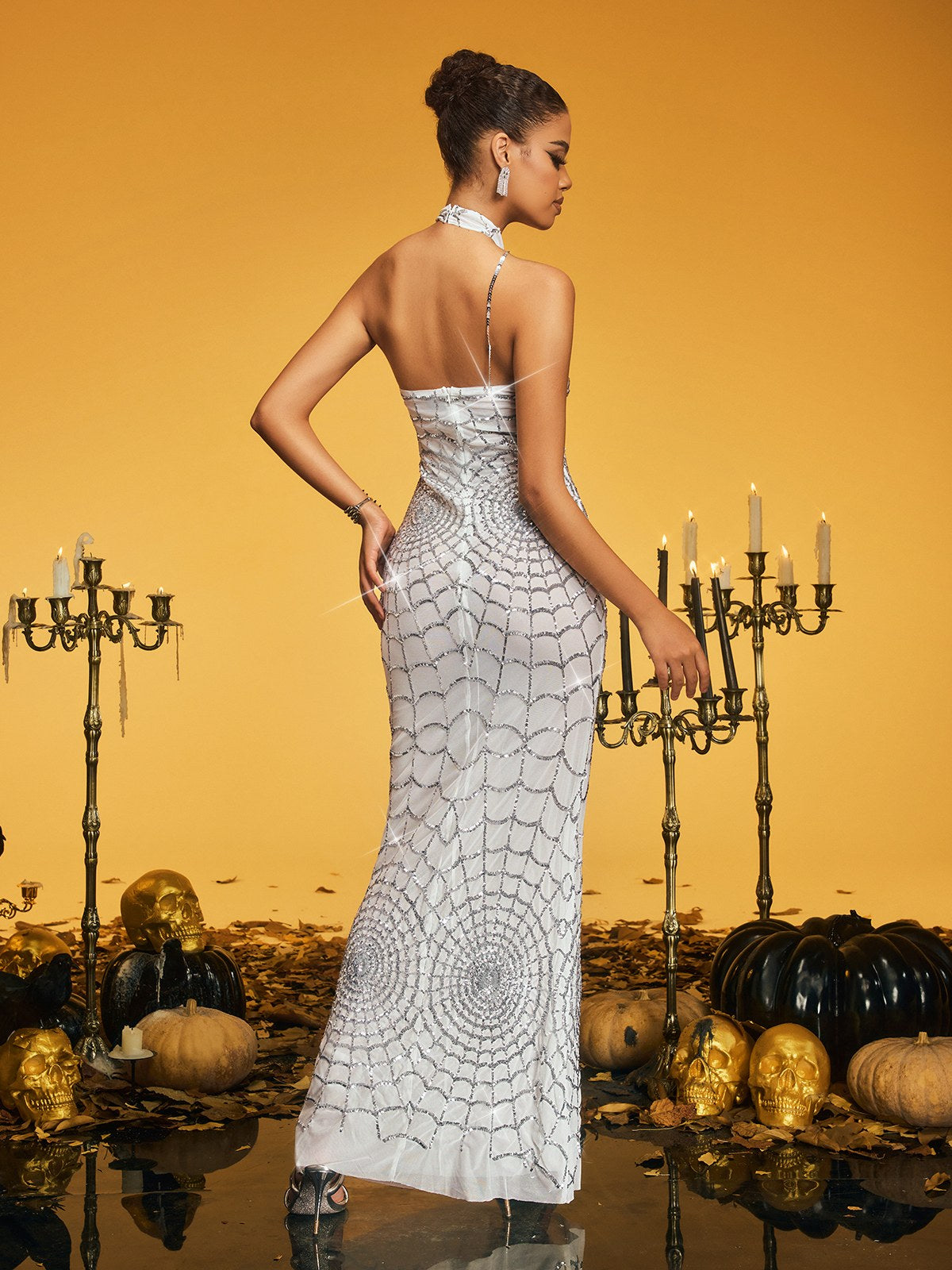 Turn heads with the Pagan Halterneck Sequin Cobweb Maxi Dress. a stunning statement piece that merges elegant glamour with bold edge. Crafted with shimmering sequins arranged in an intricate cobweb pattern. this dress reflects light beautifully at every angle. The halterneck design highlights your shoulders and neckline. while the flowing maxi length adds a touch of drama and movement. Perfect for evening events or special occasions. this dress ensures you stand out with confidence and style. Embrace a unique blend of sophistication and daring with this unforgettable showstopper.