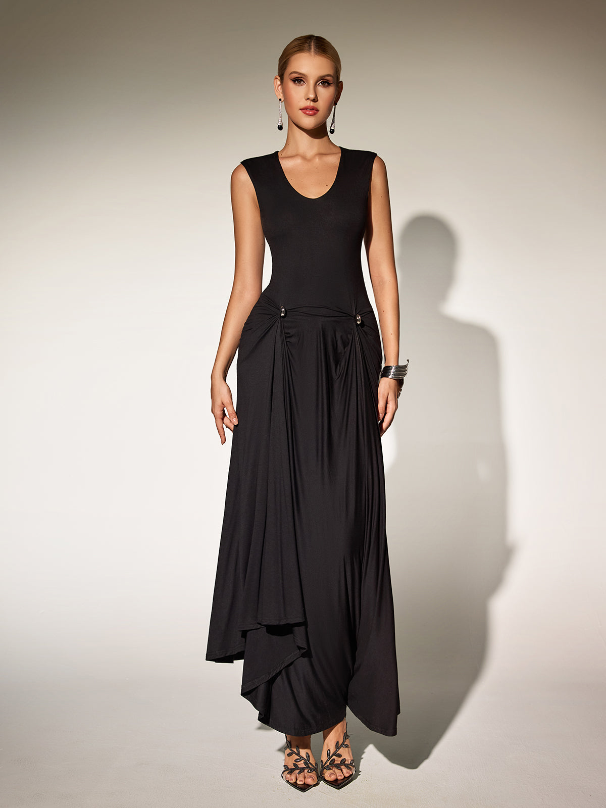 Make a stunning statement with the Paldor V Neck Ruched Maxi Dress in Black. Designed to accentuate your curves. the ruched detailing creates a flattering fit. while the deep V-neckline adds a touch of elegance. Its flowing maxi length ensures graceful movement. perfect for formal events or evenings out. Embrace timeless sophistication with this versatile dress that effortlessly combines comfort and style.