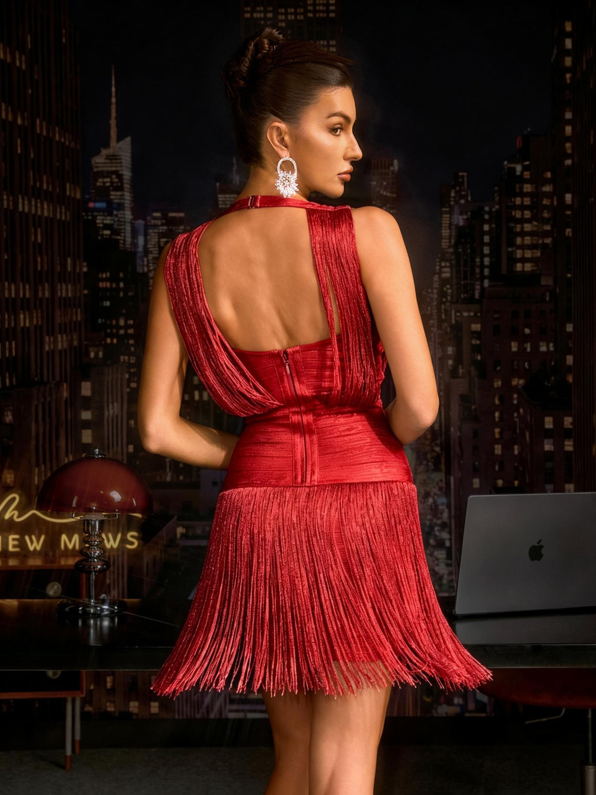 Elevate your evening look with this stunning Pyrith V Neck Fringe Bandage Mini Dress In Red. The sleek metallic finish catches the light beautifully. while the flattering bandage construction hugs your curves in all the right places. Delicate fringe detailing adds movement and dimension. creating an eye-catching silhouette that commands attention. Perfect for cocktail parties. nights out. or any occasion where you want to make a bold statement. This dress combines sophisticated elegance with modern edge—a versatile piece that transitions seamlessly from day to night.