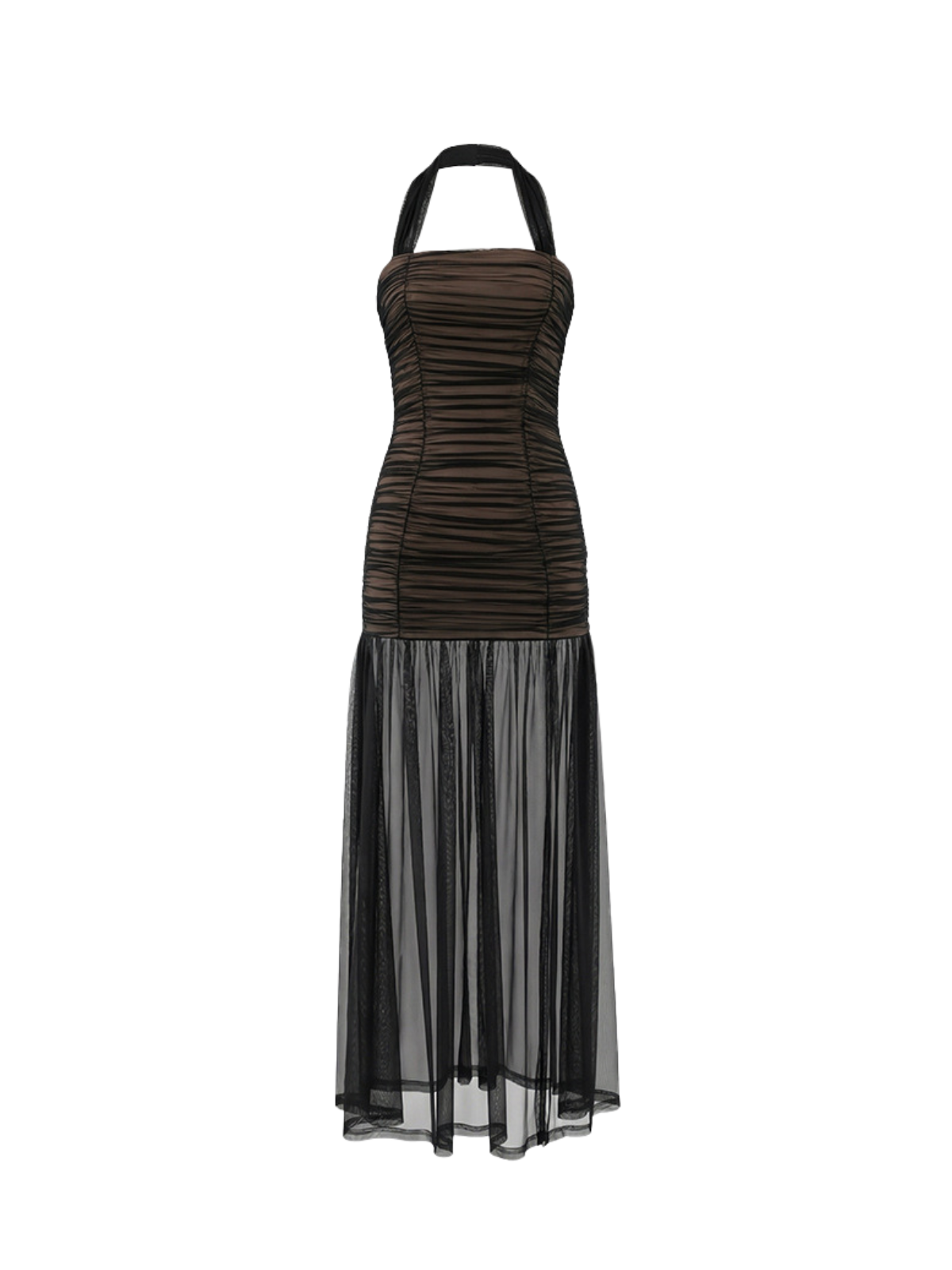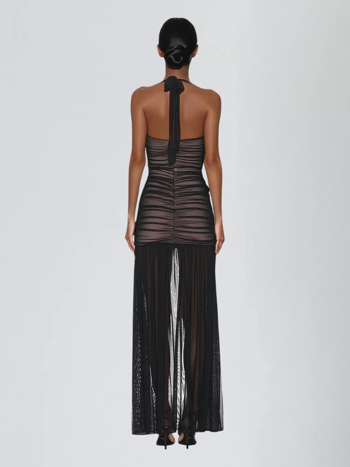 Elevate your evening look with this stunning Pyvion Halterneck Mesh Ruched Split Maxi Dress. The ruched detailing creates a flattering silhouette while the daring split adds movement and sophistication. Crafted from luxurious mesh fabric. this dress transitions seamlessly from cocktail events to upscale dinners. The halterneck design offers elegant support and a modern edge that commands attention. Perfect for those who refuse to blend in. this piece combines timeless elegance with contemporary flair for an unforgettable impression.