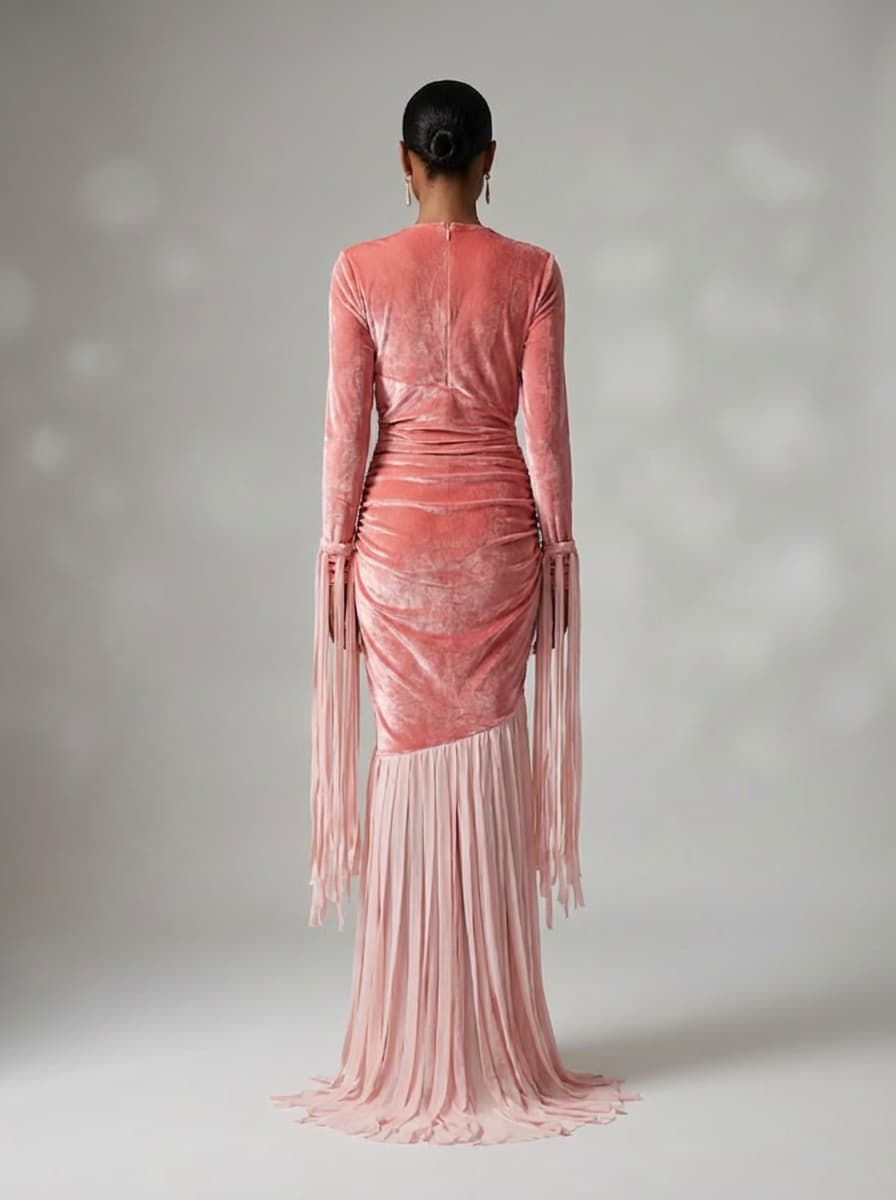 Elevate your evening look with the Qgatex V Neck Ruched Fringe Maxi Dress—a stunning piece that combines timeless elegance with contemporary flair. The flattering V neckline draws attention upward while strategic ruching creates a sculpted silhouette that flatters every figure. Delicate fringe detailing adds movement and dimension. ensuring you'll turn heads at any occasion. Perfect for cocktail events. weddings. or upscale dinners. this maxi dress delivers sophisticated style without compromising comfort. The flowing length provides an effortless. graceful aesthetic that works beautifully from season to season. Make a memorable impression in a dress designed to make you feel confident and radiant.