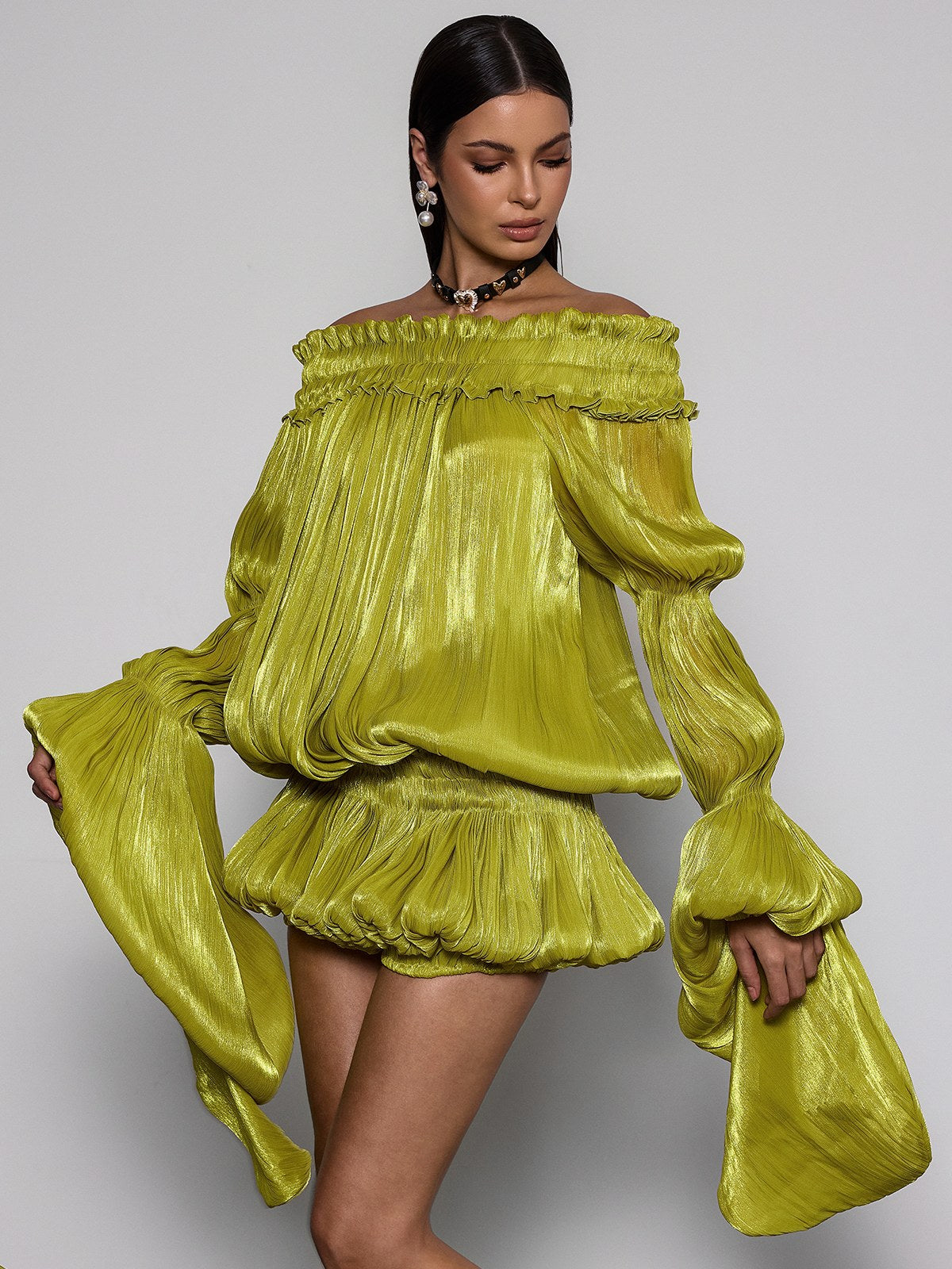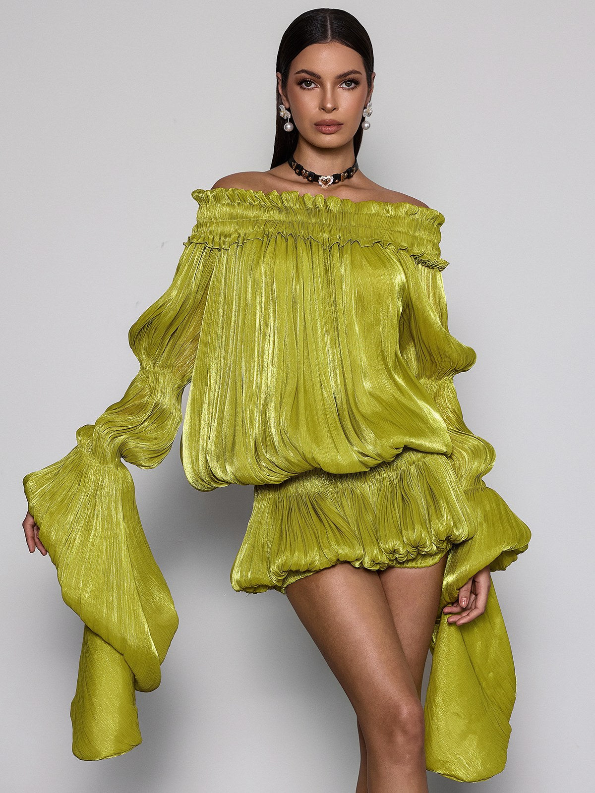 Elevate your wardrobe with the Salyxen Off Shoulder Ruched Dress Set in Green. This stunning ensemble features an elegant off-shoulder neckline that frames your shoulders beautifully. while strategic ruching creates a flattering silhouette that hugs your curves in all the right places. The rich green hue offers versatility for both casual outings and special occasions. Perfect for those seeking a sophisticated yet comfortable look. this dress set combines contemporary style with timeless appeal. Whether you're heading to brunch or an evening event. you'll feel confident and chic in this must-have piece.