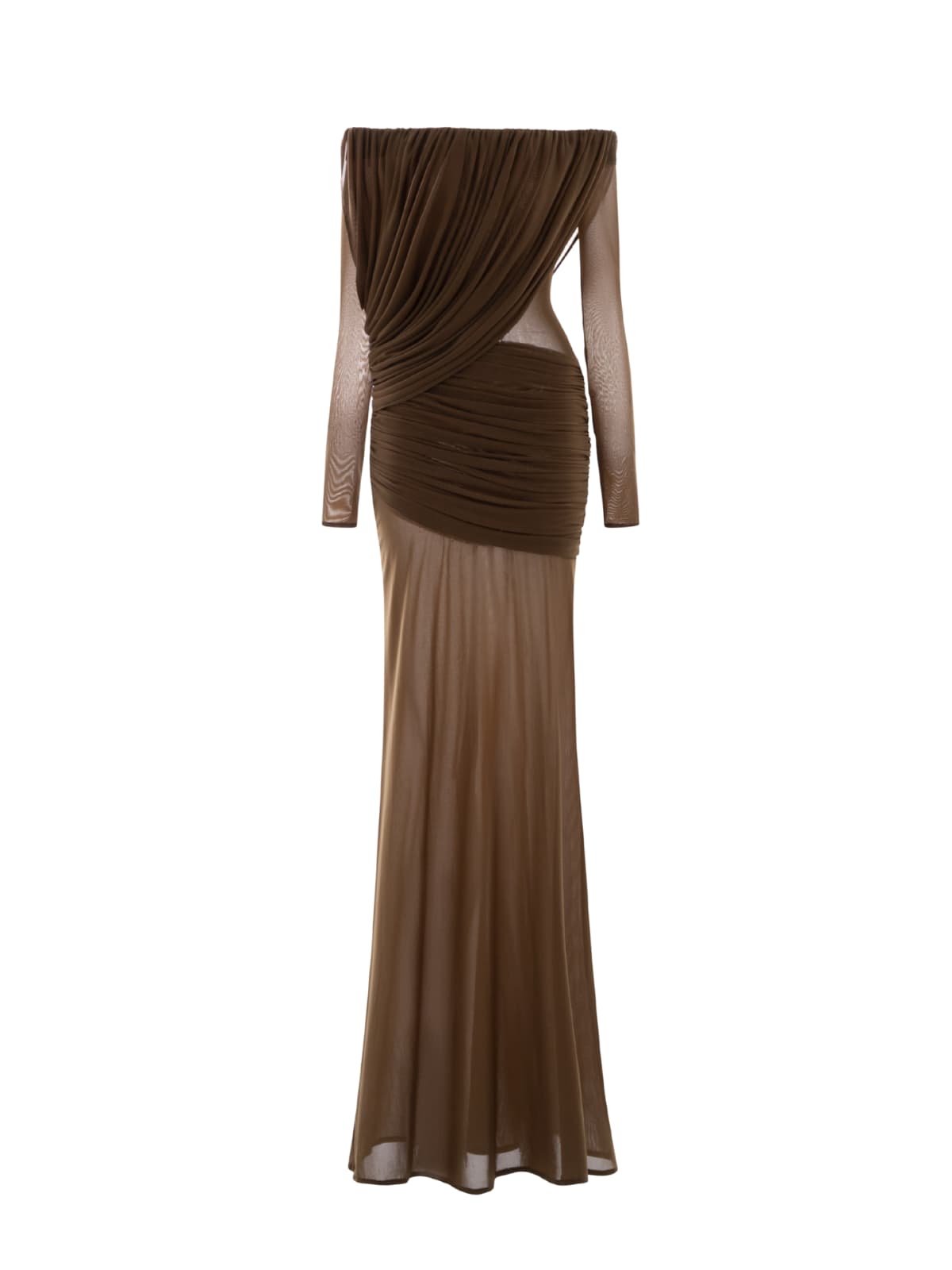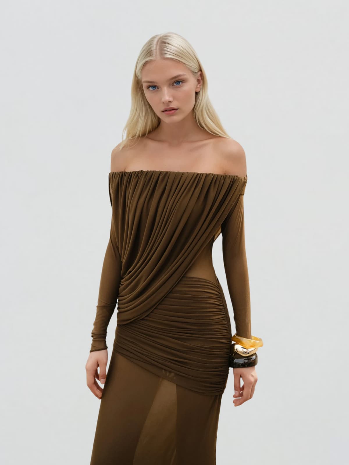 Elevate your evening wardrobe with this stunning Upwellix Off Shoulder Draped Mesh Maxi Dress In Brown. The graceful draping creates an effortlessly sophisticated silhouette. while the sheer mesh fabric adds an alluring touch of elegance. Perfect for special occasions. date nights. or upscale events. this dress combines timeless style with modern flair. The off-shoulder neckline flatters your features and creates a romantic. feminine look that turns heads. Versatile enough to dress up with heels and jewelry or down with minimal accessories. this piece is a wardrobe essential for anyone seeking refined. statement-making style.