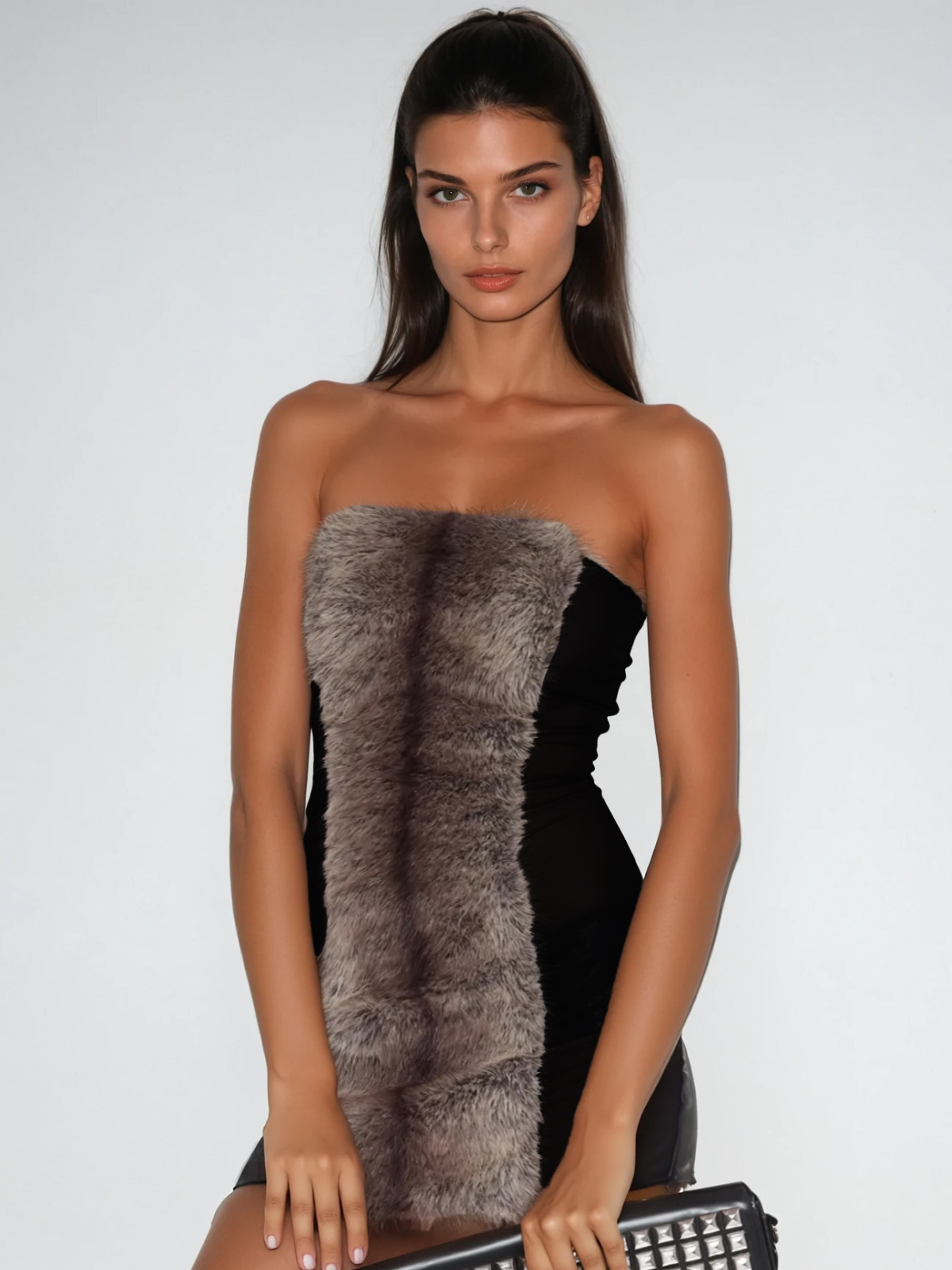 Turn heads effortlessly in the Vazgoth Strapless Mesh Furry Mini Dress. This daring design combines a sheer mesh base with soft furry accents for a bold. tactile contrast. Its strapless cut highlights your neckline and shoulders. while the mini length adds a playful. flirty edge. Perfect for night outs or special occasions. this dress makes a confident statement wherever you go. Embrace your daring side with a look that's both edgy and captivating.